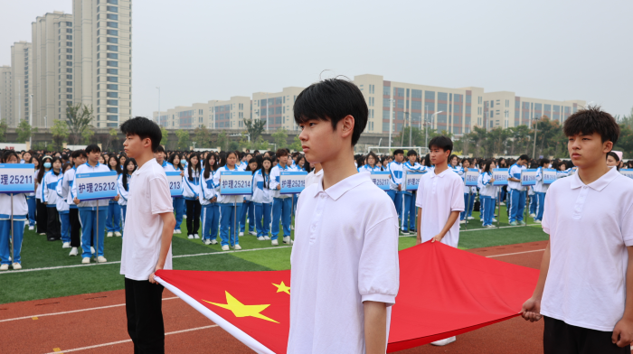 国旗护卫队迈着铿锵有力的步伐进入会场,庄严的升旗仪式拉开了整场典礼的帷幕。全体师生肃立注目,嘹亮的国歌声响彻了整个校园。大会伊始,教师代表段星发表演讲:“健康所系,性命相托”,盼望同学们要怀抱崇高理想,奋力拼搏,不断培养自己的学习能力和专技水平。作为广大教师队伍中的一员,他承诺会永远秉持教书育人的理念,努力成为学生成长路上称职的引路人。随后,学生代表潘苏童用激昂的话语深情地感念学校的培养。她承诺一定会奋勇争先,用顽强拼搏的斗志和永不放弃的毅力为国家的卫生事业做出自己的贡献,追逐属于自己的青春梦想。