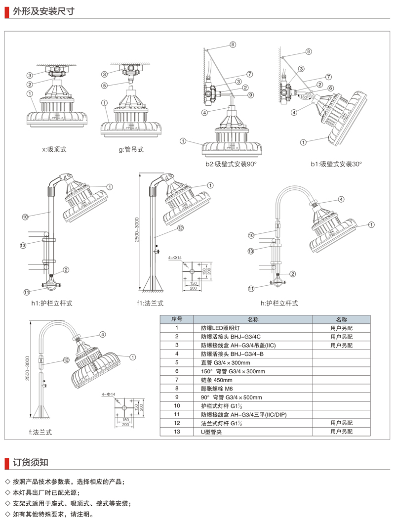 吸顶式防爆灯安装:吸顶式防爆灯主要安装配件用到多的就是防爆灯具、3/4两外防爆活接头、3/4直通吊防爆接线盒,将3/4防爆活接头旋入防爆灯3/4出线口,3/4防爆活接头另外一端旋入3/4转换防爆接线盒,分别拧紧紧定螺纹,然后穿过电缆,安装在屋项,后将电缆依次穿过垫片、密封圈直至接线盒内(预留出一定长度的电缆方使接线),再将灯体与接头拧紧,拧紧紧定螺钉。当然也有别的安装配件可使用,比如中间用防爆管接头、直杆等过度安装,下面是安装示意图仅供参考