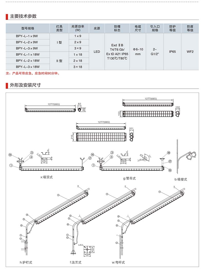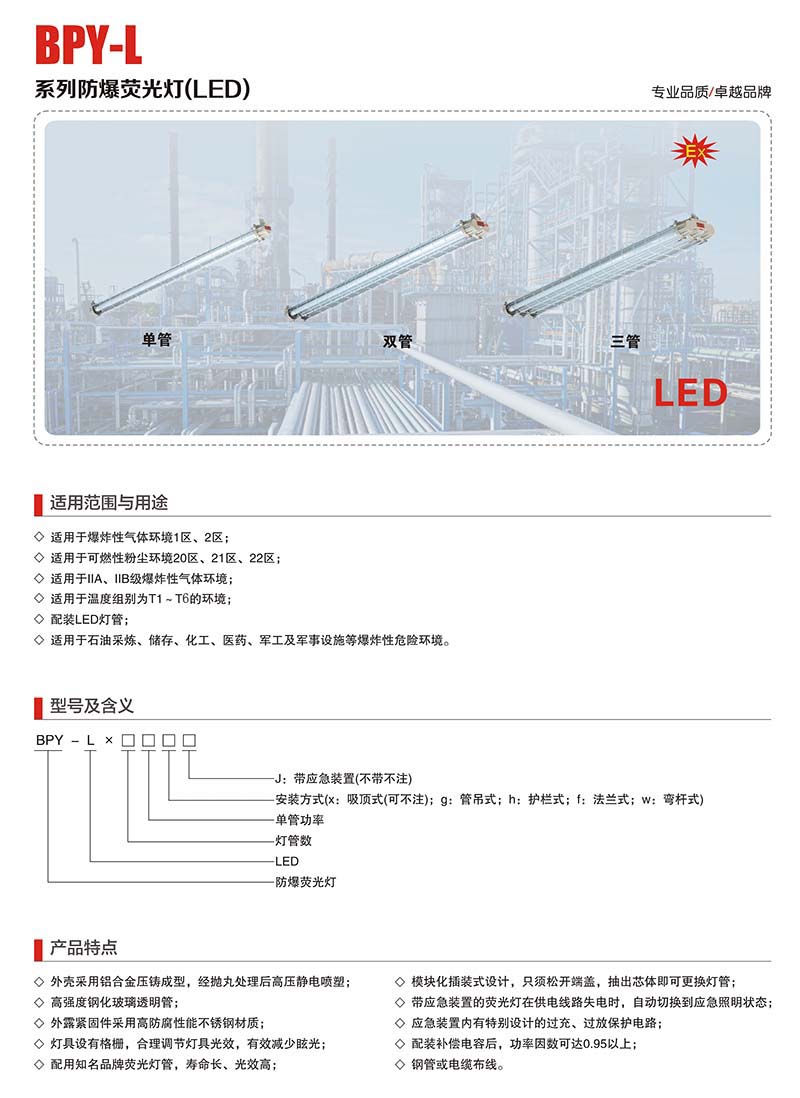 BPY防爆荧光灯安装方式有几种,这是很多客户在询价时会问到的问题,其实BPY防爆荧光灯常用的就是标配的安装配件吸顶式。BPY系列隔爆型防爆荧光灯,适用于性气体环境1区、2区;灯具出厂时已配置光源,也可根据用户需求自己提供光源,用户接入电源即可使用。适用于ⅡA、ⅡB级性气体环境,温度组别为T1~T6的环境。BPY防爆荧光灯一般有吸顶式、壁式、管吊式等多种安装方式。吸顶式的安装方式是出厂时标配的安装配件为8个大螺杆加防爆接线盒、换接头、U型安装支架,壁挂式安装?:先将灯体通过支架安装在墙壁或其他支撑件上,确保遮光板在灯泡正上方。然后将电缆依次穿过接头、垫片、密封圈直至接线盒内,预留出一定长度的电缆方便接线。后旋紧接头,拧紧紧定螺钉?。管吊式先将接头穿过电缆,旋入钢管,拧紧紧定螺钉。再将电缆依次穿过垫片、密封圈直至接线盒内,预留出一定长度的电缆方便接线。然后将灯体与接头拧紧,后拧紧紧定螺钉?。