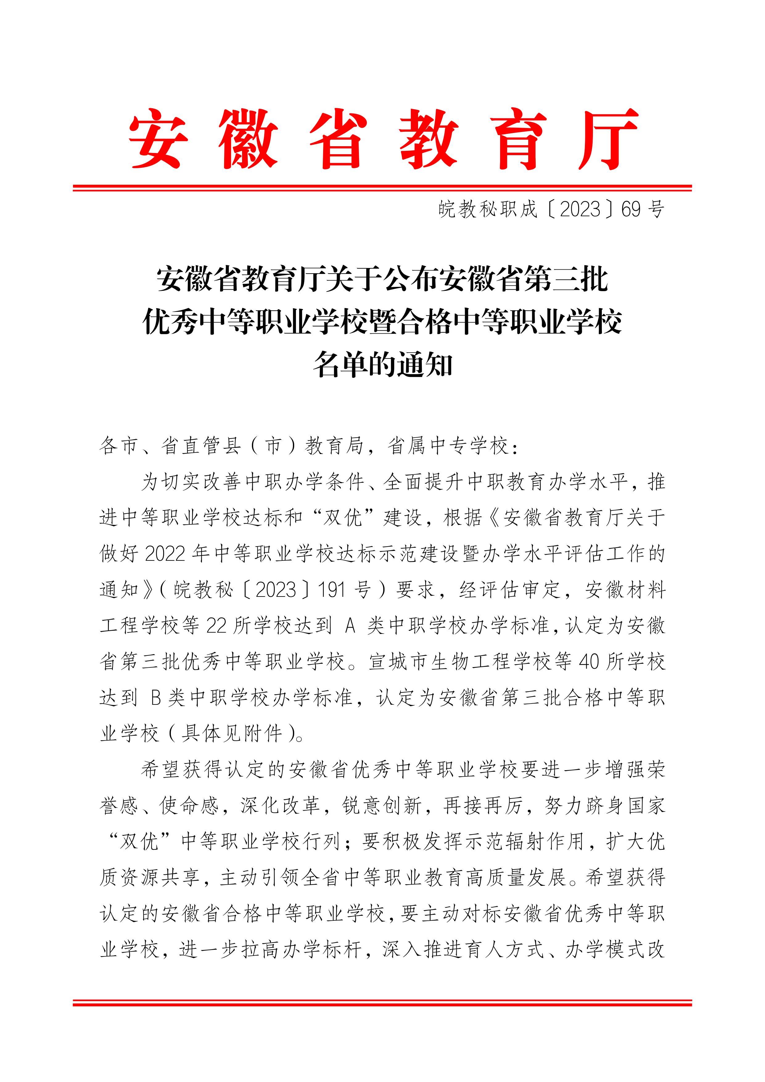安徽省教育厅关于公布安徽省第三批优秀中等职业学校暨合格中等职业学校名单的通知