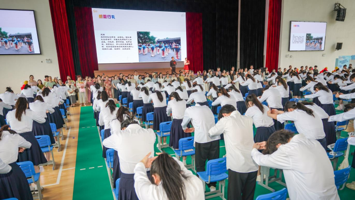 仪式正式开始前,学生们携手跨越成人门步入会场,象征着人生旅程迈入全新的阶段。随后,他们共同体验传统的沃盥之礼,净手明志,寓意洗净双手、净化心灵,摒弃杂念,以专注虔诚的心态迎接成年的重要时刻,也体现出对这一庄严仪式的敬重之情。