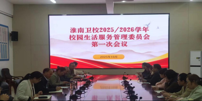 为全面提升校园生活服务保障水平,构建和谐、便捷、优质的校园服务环境,2025年10月30日下午,淮南卫校2025-2026学年校园生活服务管理委员会第一次会议在明德楼一楼会议室隆重召开。校党委委员、副校长沈安庆出席会议并作讲话,总务科、学生科、保卫科、校办公室、工会等职能部门负责人,校园第三方服务单位负责人和新一届校管委学生代表共同参会。