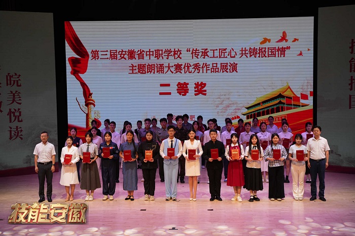 由安徽省教育厅、省人力资源和社会保障厅、省总工会、共青团安徽省委员会联合主办的第三届安徽省中职学校“传承工匠心 共铸报国情”主题朗诵大赛圆满落幕。经过激烈角逐,我校参赛团队凭借对大赛主题的深刻理解与出色的舞台感染力,荣获省级二等奖,展现了我校学子卓越的综合素养。