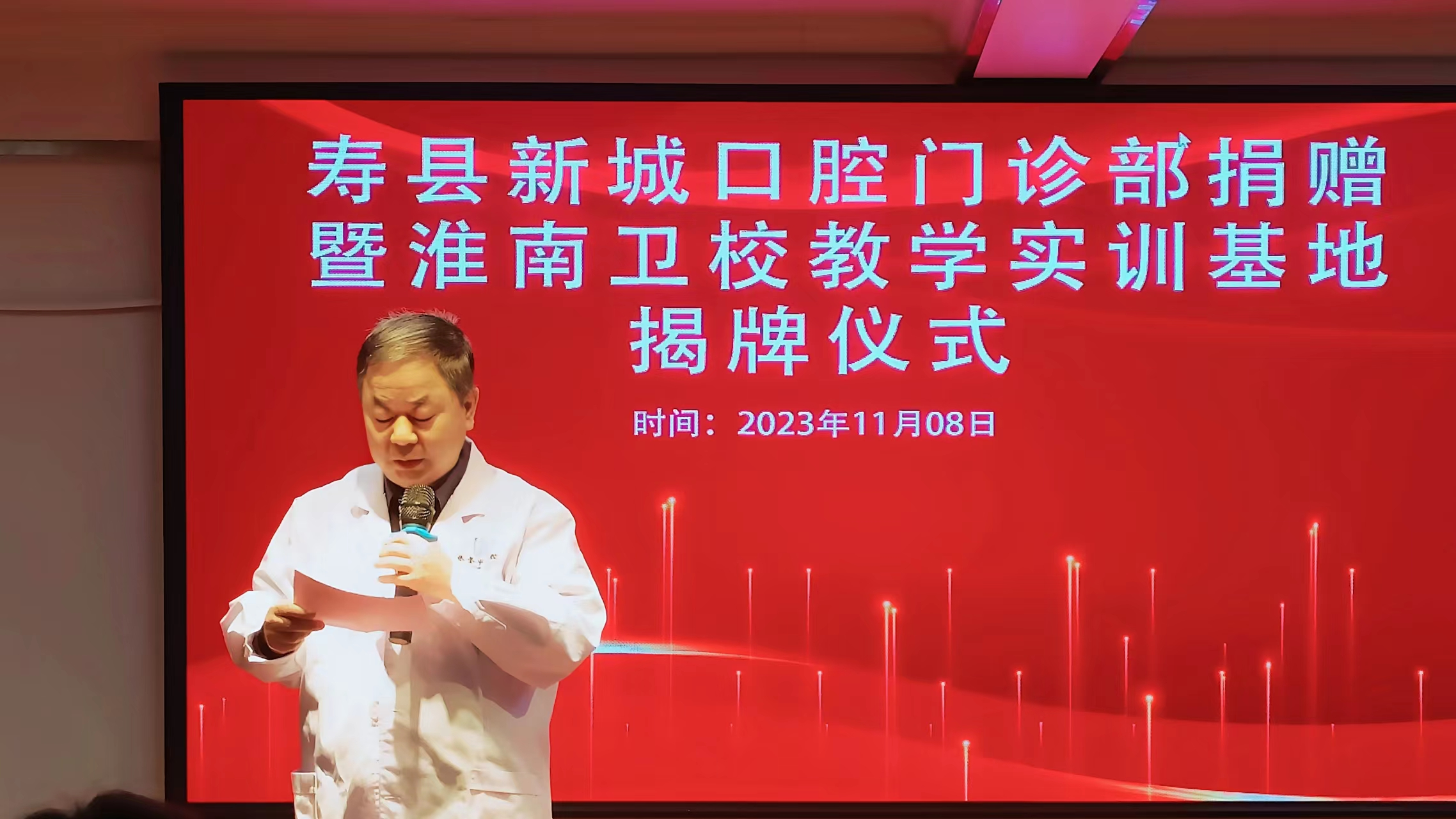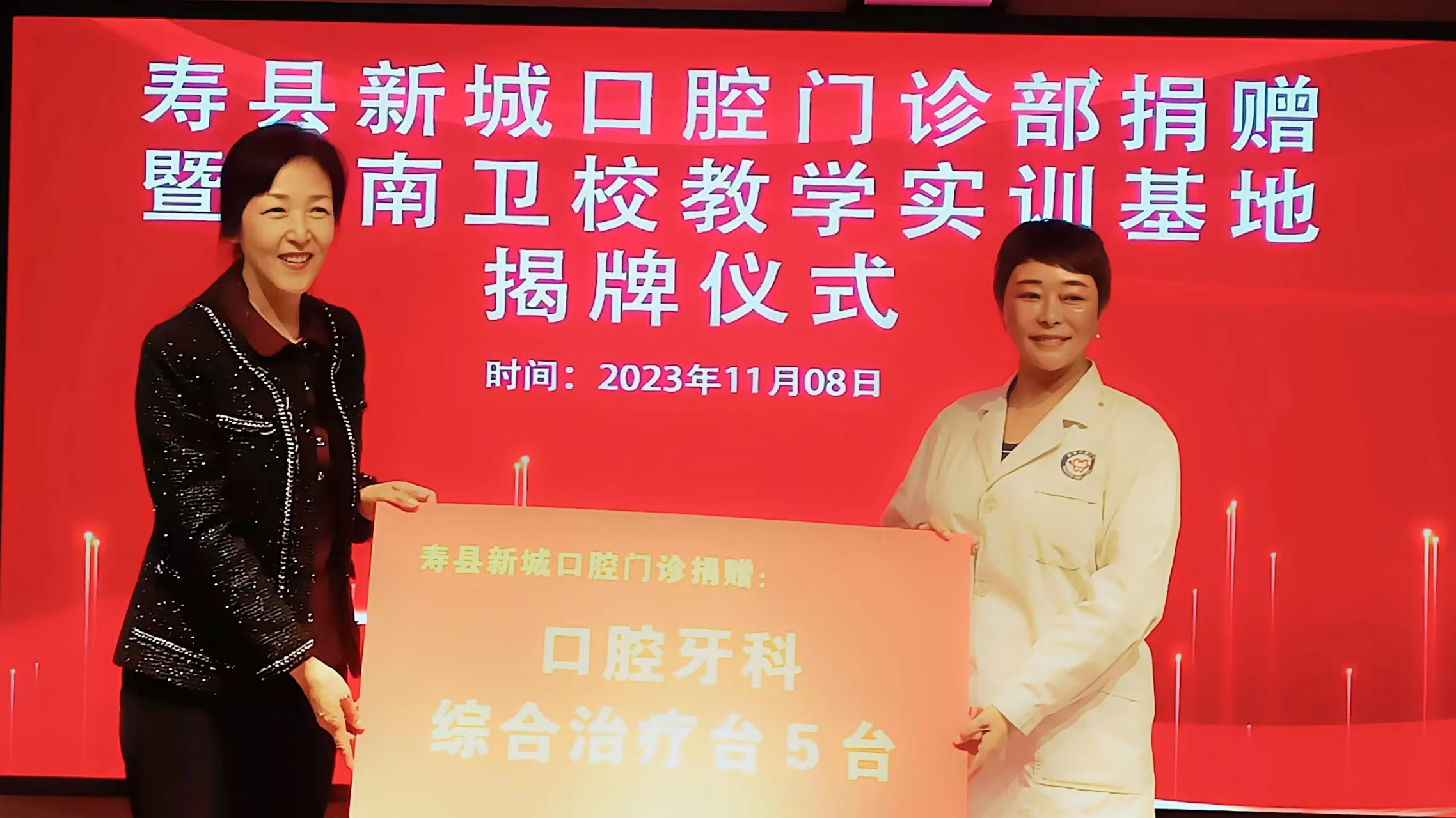 为深入学习贯彻习近平新时代中国特色社会主义思想和党的二十大精神,扎实推进学习贯彻习近平新时代中国特色社会主义思想主题教育,推进校企共建,赋能产教融合,强化优势互补、实现资源共享,形成校企协同育人合力,推动职业教育创新发展,助力卫生类毕业生更好地实习就业,11月8日,在寿县新城口腔门诊部会议室举行寿县新城口腔门诊捐赠暨bb贝博艾弗森官方网站教学实训基地揭牌仪式。淮南卫校党委书记孙娟,副校长沈安庆、栾振知依以及相关科室负责人出席;淮南市口腔医学学会秘书孙同庆,寿县新城口腔门诊部董事长张圣平,院长吴冬梅以及各科室主要负责同志参会,仪式由寿县新城口腔门诊部办公室主任王艮主持。