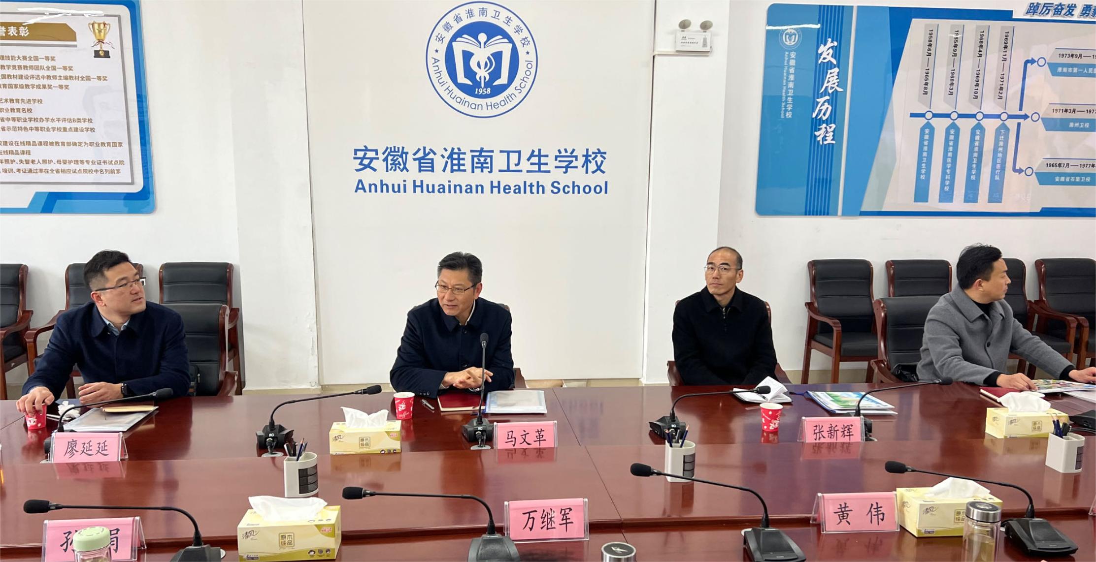 12月26日上午,淮南市委常委、市委组织部部长马文革,市政协副主席、淮南联大党委书记万继军一行莅临淮南卫生学校调研职业教育发展情况。市人社局副局长张新辉,市党员电化教育中心主任廖延延,市委组织部人才工作科科长王卿田参加调研,淮南联大党委委员、淮南卫校党委书记孙娟,淮南联大党委委员、副校长黄伟,淮南联大党委委员、组织人事部部长朱银斌,淮南联合大学党政办公室主任余永亮及淮南卫校领导班子陪同调研。