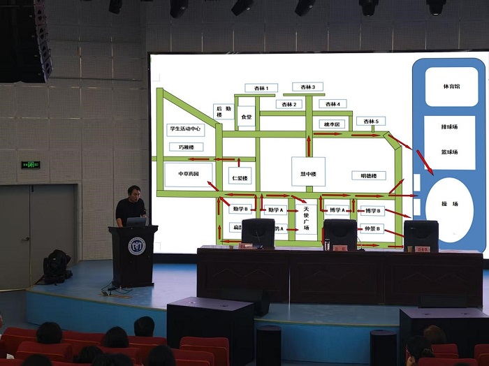 2025年 5月9日下午,我校全体教师、学生代表及第三方人员代表齐聚学生活动中心大礼堂召开应急疏散培训会,大会由校党委委员、副校长栾振知主持。栾校长从学校安全工作的整体布局出发,强调了“安全、有序、实效、责任”几个关键词,阐述应急疏散演练在校园安全工作中的关键地位,要求全体师生要提高思想认识,以高度的责任感和使命感对待此次演练,确保演练活动顺利开展,达到“人人讲安全、个个会应急”的目标。